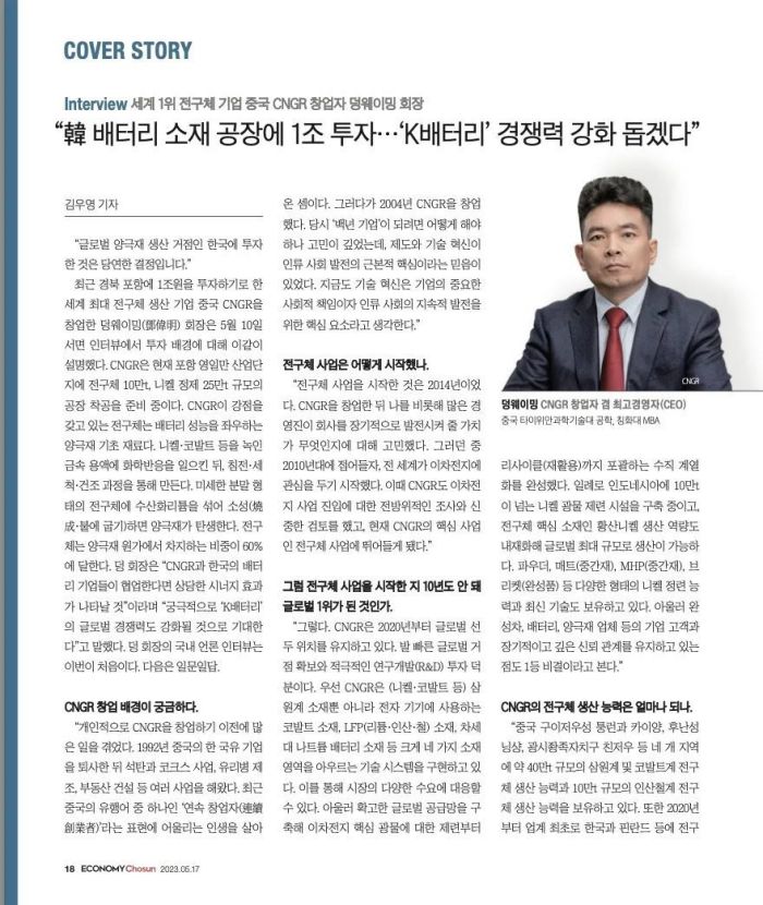 近日,韓國權(quán)威經(jīng)濟(jì)周刊《Economy Chosun(經(jīng)濟(jì)朝鮮)》專訪中偉股份董事長鄧偉明,并以“封面故事”刊發(fā)在第492期以“電池之戰(zhàn)”為主題的周刊中。