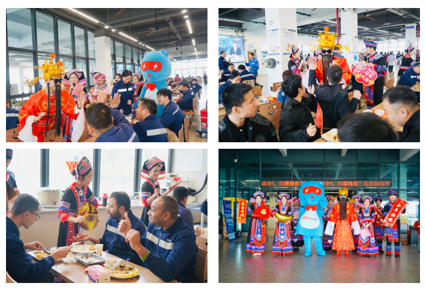 基地形象大使團也迎來了“驚艷首秀”。他們與活潑可愛的“鋰電寶寶”、喜氣洋洋的“財神爺”共同集結,組成了一支活力滿滿的送福小分隊。在濃厚的節日氛圍中,這支“福氣天團”通過創意十足的互動與沉浸式文化體驗,正式拉開了基地辭舊迎新、共赴新篇的華麗序幕。“互動體驗巡游”環節點燃了全場最高熱情。員工們爭相與“財神爺”大力擊掌、擁抱“金元寶”,在響亮的掌聲中“掌”握新年好彩頭。“接福挑戰”更是一場智慧與默契的較量,大家妙語連珠,接力送出“一馬當先”的節日祝福。摩洛哥同事也深受感染,熱情加入其中,中外伙伴歡聚一堂,在歡聲笑語間繪就了一幅跨越國界的文化交融新春圖景。