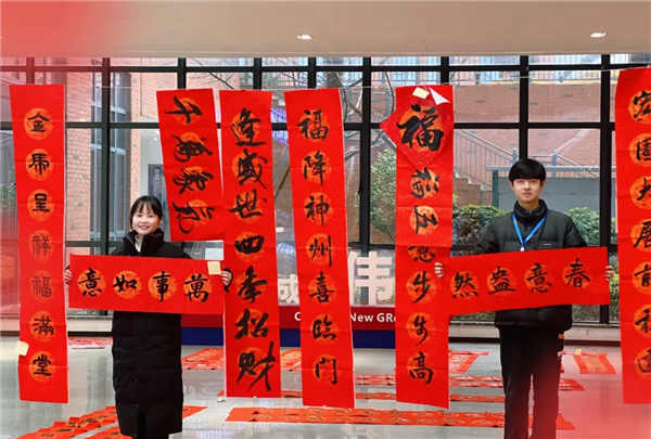 書法愛好者揮毫弄墨,筆尖如行云流水,將美好祝福揮灑,字里行間飽含對公司和同事的祝愿。一旁的看客或幫忙固定紙張,或仔細端詳一幅幅紅火的春聯,為書法大師點贊,在緊張忙碌的工作之余,體驗到了不一樣的歡樂。